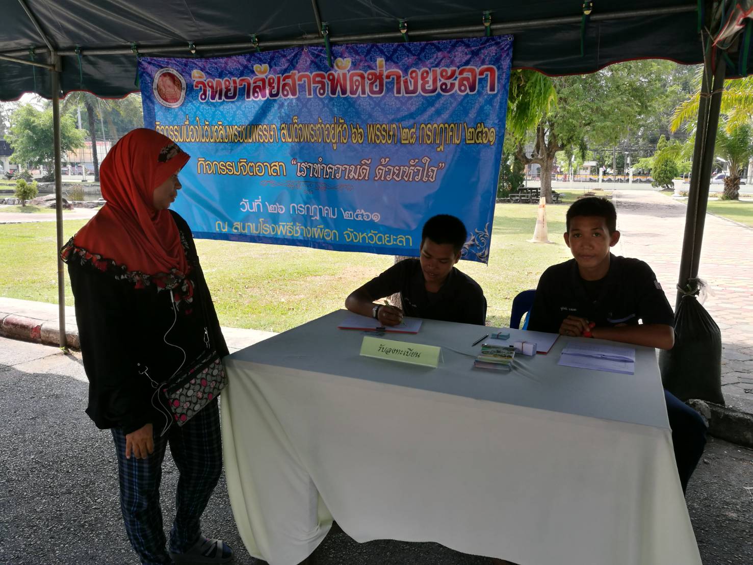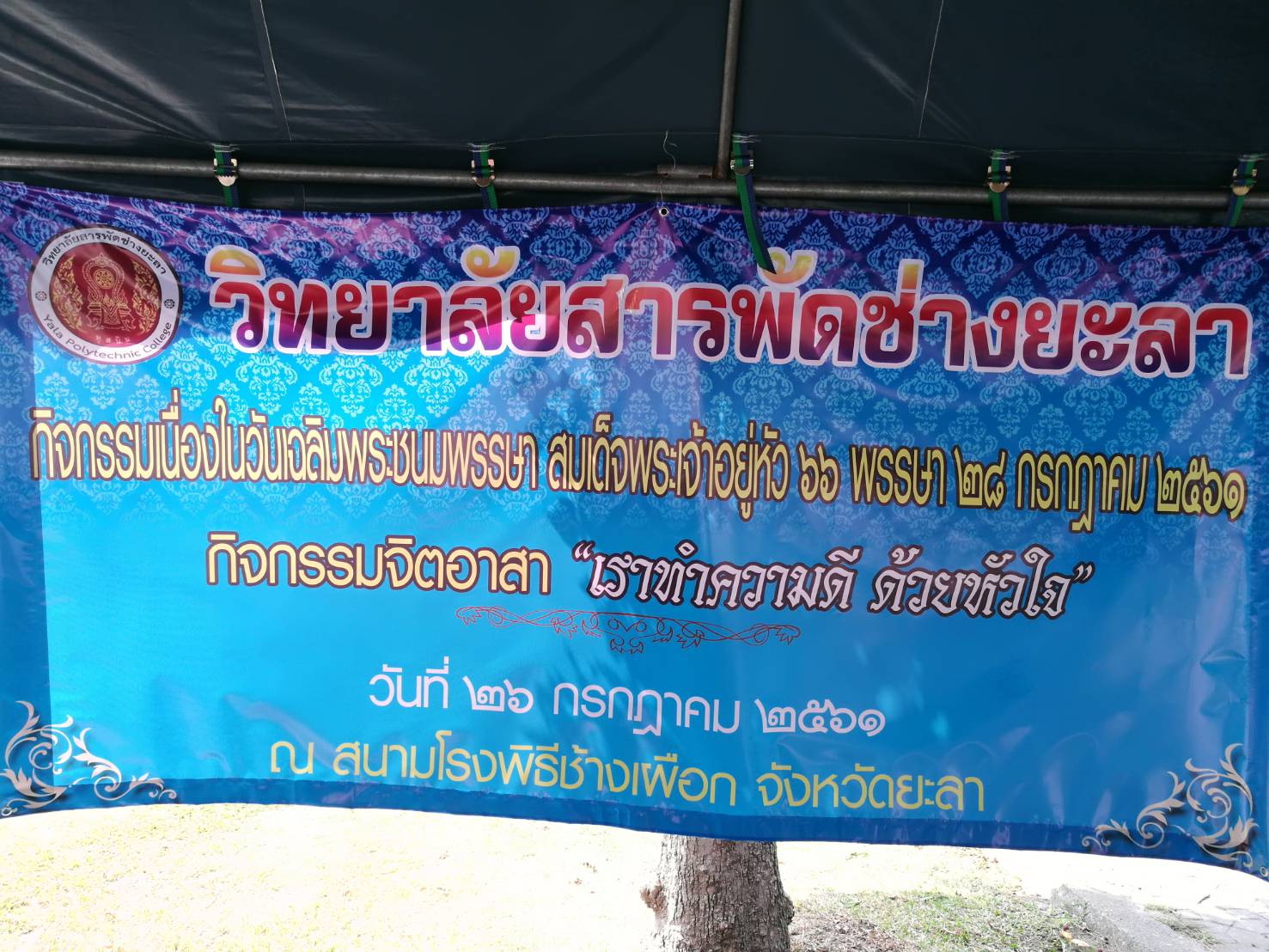 วันที่ 26 กรกฎาคม 2561 วิทยาลัยสารพัดช่างยะลา ดำเนินกิจกรรมเนื่องในวันเฉลิมพระชนมพรรษา สมเด็จพระเจ้าอยู่หัว 66 พรรษา 28 กรกฎาค 2561 กิจกรรมจิตอาสา "เราทำความดี ด้วยหัวใจ" ณ สนามโรงพิธีช้างเผือก จังหวัดยะลา