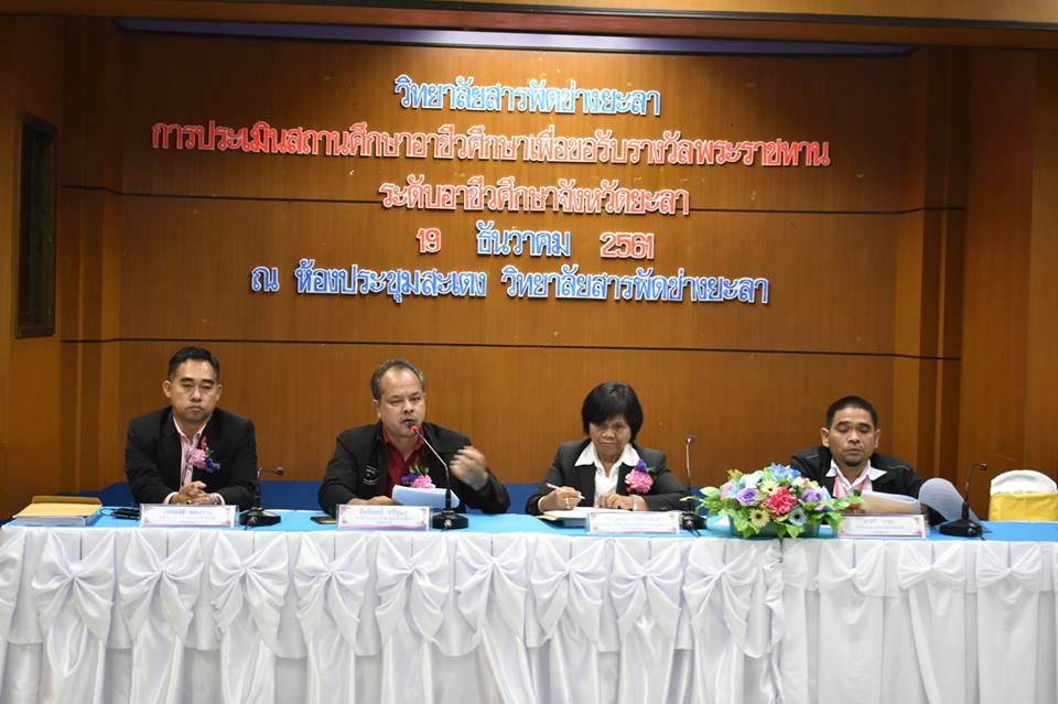 วันพุธที่ 19 ธันวาคม 2561 เวลา 14.30 น. นางวรางคณา วิจิตรพันธ์ ผู้อำนวยการวิทยาลัยเทคโนโลยีบริหารธุรกิจยะลา ประธานกรรมการ พร้อมด้วย คณะกรรมการ เข้าร่วมการประเมินและคัดเลือกสถานศึกษาอาชีวศึกษาเพื่อรับรางวัลพระราชทาน ประจำปีการศึกษา 2561 ระดับอาชีวศึกษาจังหวัดยะลา โดยมีผู้บริหาร คณะครู บุคลากรทางการศึกษา และตัวแทนนักเรียน นักศึกษา เข้าร่วมโดยพร้อมเพรียงกัน ณ ห้องประชุมสะเตง วิทยาลัยสารพัดช่างยะลา