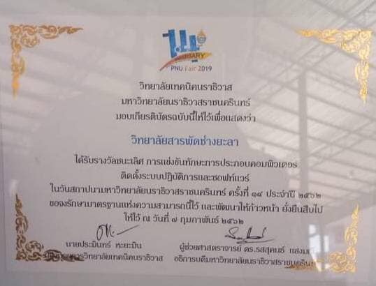วิทยาลัยสารพัดช่างยะลา ขอแสดงความยินดีแก่ นักศึกษา สาขาวิชาคอมพิวเตอร์ธุรกิจ ที่ได้รับรางวัลชนะเลิศ จากการแข่งขันทักษะการประกอบคอมพิวเตอร์ ติดตั้งระบบปฏิบัติการและซอฟท์แวร์ ในวันสถาปนามหาวิทยาลัยนราธิวาสราชนครินทร์ ครั้งที่ 14 ประจำปี 2562 ระหว่างวันที่ 4 – 8 กุมภาพันธ์ 2562 ณ มหาวิทยาลัยนราธิวาสราชนครินทร์ 1. นายอานัส เส็งดอละ ปวส.1 สาขาวิชาคอมพิวเตอร์ธุรกิจ 2. นายอับดุลเลาะห์ หะยีหะซา ปวส.1 สาขาวิชาคอมพิวเตอร์ โดยนางสาวสูไฮยา ปิยา ครูผู้ควบคุม