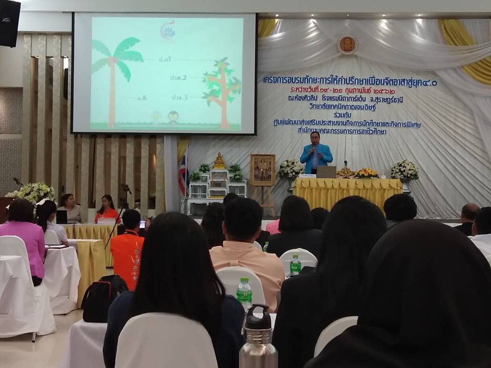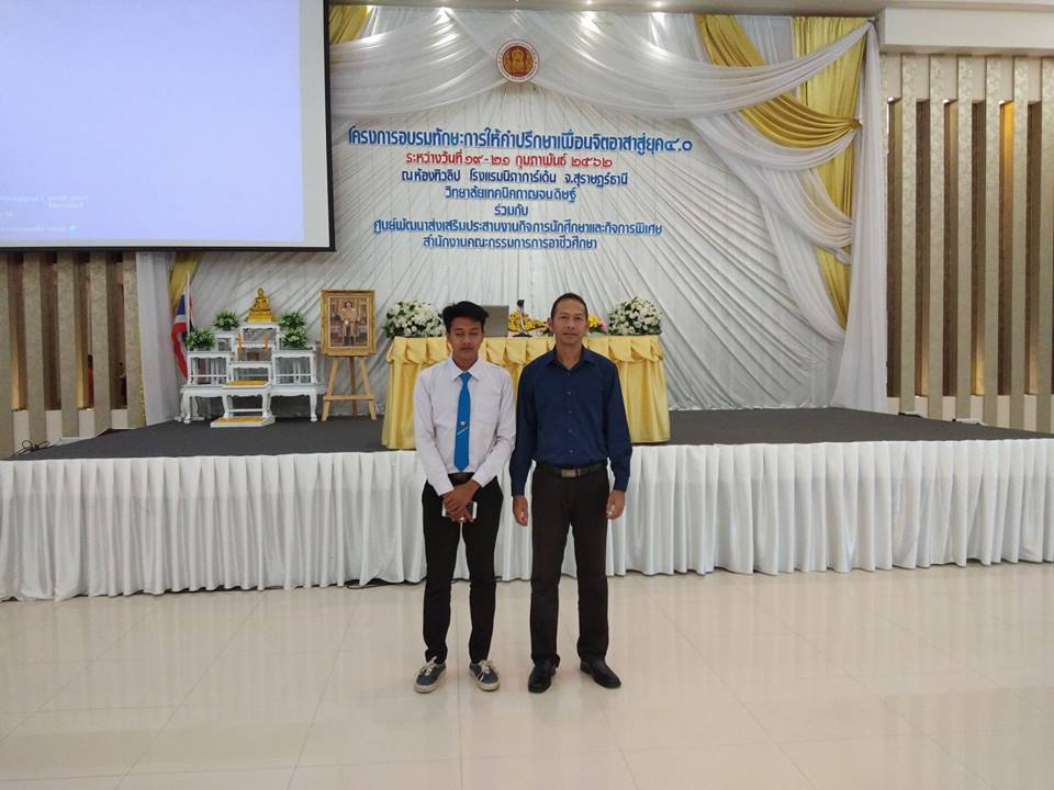 นายภาณุวัฒน์ บุญยะรัตน์ ผู้อำนวยการวิทยาลัยสารพัดช่างยะลา มอบหมายให้นายเจษฎา วาเจ๊ะ หัวหน้างานครูที่ปรึกษา และนายอานัส เส็งดอละ นักศึกษาสาขาวิชาคอมพิวเตอร์ธุรกิจ วิทยาลัยสารพัดช่างยะลา ร่วมโครงการอบรมทักษะการให้คำปรึกษาเพื่อนจิตอาสาสู่ยุค 4.0 ระหว่างวันที่ 19-20 กุมภาพันธ์ 2562 ณ ห้องทิวลิป โรงแรมนิภาการ์เด้น จังหวัดสุราษฎร์ธานี