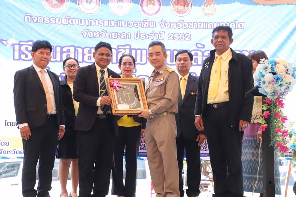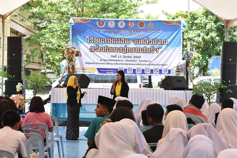 วันที่ 11 มีนาคม 2562 เวลา 10.30น. นายนิมะ มะกะเจ รองผู้ว่าราชการจังหวัดยะลา ประธานในพิธีเปิดโครงการส่งเสริมโอกาสทางการศึกษาและมีงานทำ กิจกรรมพัฒนาการแนะแนวอาชีพ จังหวัดภาคใต้ชายแดน จังหวัดยะลา ประจำปี 2562 ภายใต้โครงการมหกรรมสร้างงานสร้างอาชีพ JOB & SEC Southern Corridor โดยศูนย์ประสานงานการผลิตและพัฒนากำลังคนอาชีวศึกษา จังหวัดภาคใต้ชายแดน และสำนักงานจัดหางานจังหวัดยะลา โดยมี นายศักดิ์จิต มาศจิตต์ รองผู้อำนวยการศูนย์ประสานงานและบริหารการศึกษาจังหวัดชายแดนภาคใต้ เป็นผู้กล่าวรายงาน พร้อมด้วย นายภาณุวัฒน์ บุญยะรัตน์ ผู้อำนวยการวิทยาลัยสารพัดช่างยะลา และคณะผู้บริหาร ครู บุคลากรทางการศึกษา นักเรียน นักศึกษา ในสถานศึกษาจังหวัดภาคใต้ชายแดน และ ประชาชนทั่วไป ร่วมกิจกรรมดังกล่าว ณ วิทยาลัยเทคนิคยะลา อำเภอเมือง จังหวัดยะลา