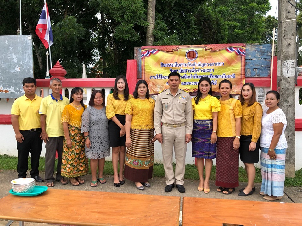 วันพฤหัสบดี ที่ 27 มิถุนายน 2562 เวลา 06.30 น. นายภาณุวัฒน์ บุญยะรัตน์ ผู้อำนวยการวิทยาลัยสารพัดช่างยะลา พร้อมด้วย คณะครู และบุคลากร ดำเนินกิจกรรมสืบสานวันสำคัญทางศาสนา ภายใต้โครงการสร้างจิตสำนึกความรักสถาบันชาติ ศาสนา และพระมหากษัตริย์ โดยทำบุญตักบาตร ณ บริเวณด้านหน้าวิทยาลัยสารพัดช่างยะลา