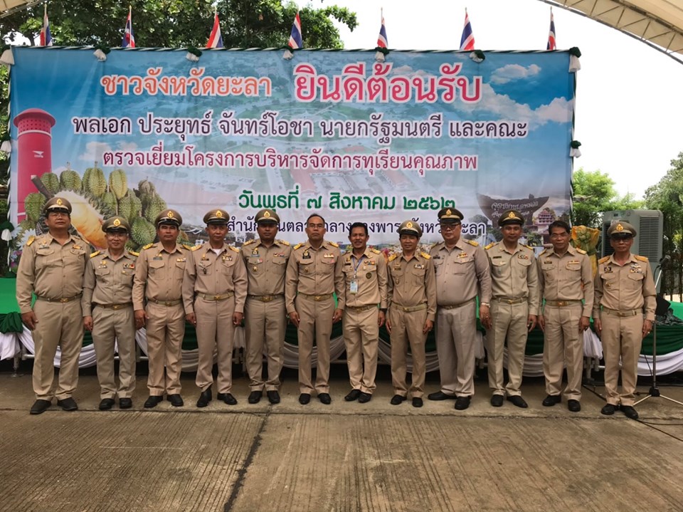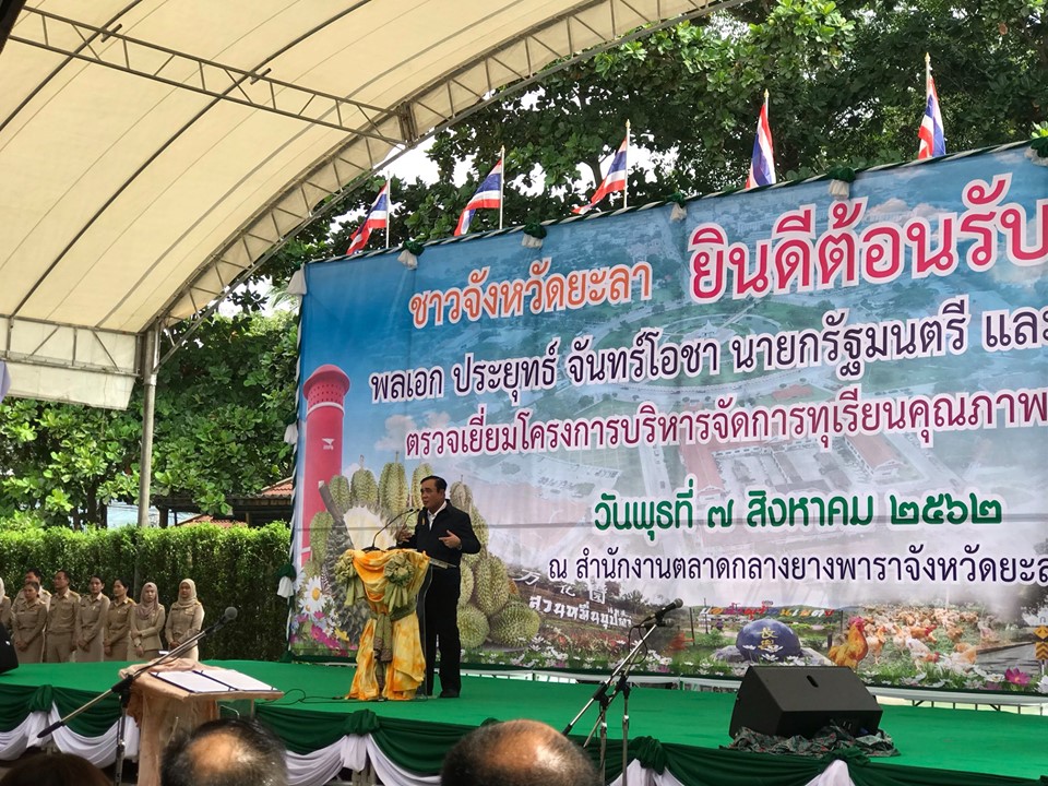 วันที่ 7 สิงหาคม 2562 เวลา 13.35 น. พลเอกประยุทธ์ จันทร์โอชา นายกรัฐมนตรี ตรวจเยี่ยมโครงการบริหารจัดการทุเรียนคุณภาพ จากกลุ่มสมาชิกเกษตรแปลงใหญ่ และพบปะพี่น้องประชาชน โดยมีนายอนุชิต ตระกูลมุทุตา ผู้ว่าราชการจังหวัดยะลา กล่าวรายงานการดำเนินโครงการ และมีนายภาณุวัฒน์ บุญยะรัตน์ ผู้อำนวยการวิทยาลัยสารพัดช่างยะลา พร้อมทั้งหัวหน้าส่วนราชการ และประชาชน ร่วมให้การต้อนรับ ณ ตลาดกลางยางพารายะลา ตำบลสะเตง อำเภอเมือง จังหวัดยะลา