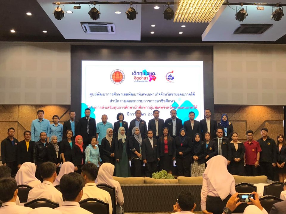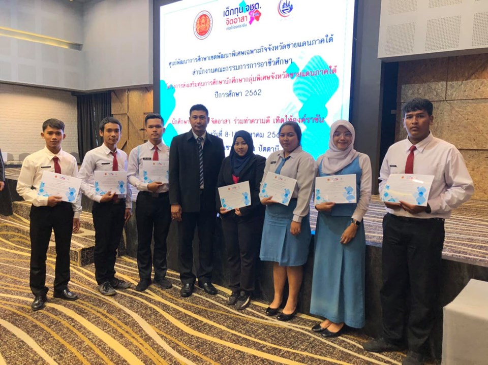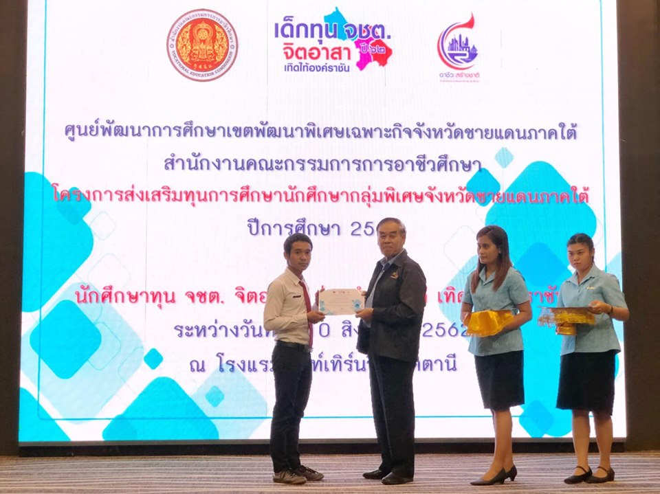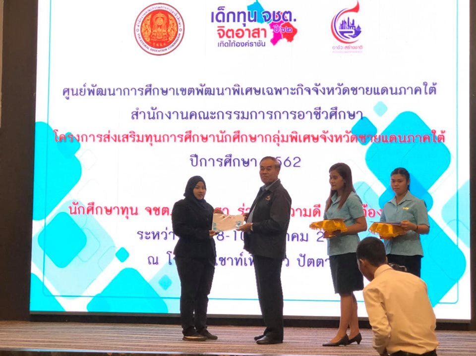 68286453 1531803716944961 8614604312917573632 nวันเสาร์ ที่ 10 สิงหาคม 2562 นายภาณุวัฒน์ บุญยะรัตน์ ผู้อำนวยการวิทยาลัยสารพัดช่างยะลา ร่วมพิธีปิดโครงการส่งเสริมทุนการศึกษา นักศึกษา กลุ่มพิเศษจังหวัดชายแดนภาคใต้ ประจำปีการศึกษา 2562 ดำเนินโครงการโดยศูนย์พัฒนาการศึกษาเขตพัฒนาพิเศษเฉพาะกิจจังหวัดชายแดนภาคใต้ ณ โรงแรมเซาท์เทิร์นวิว จังหวัดปัตตานี