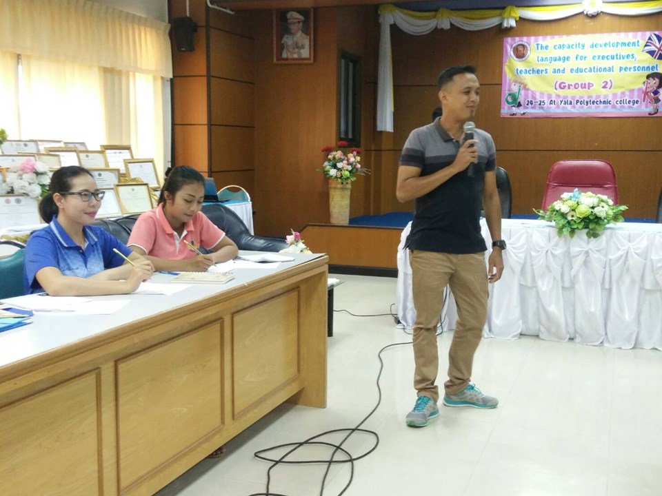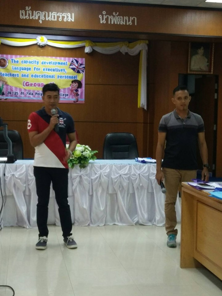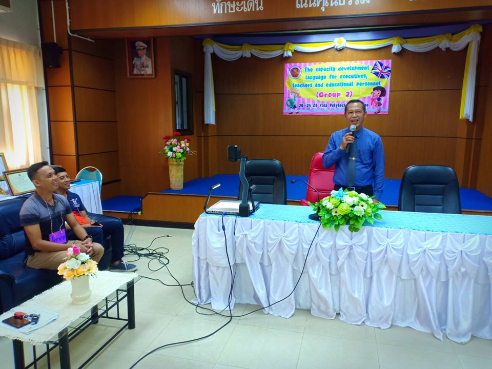 วันที่ 24 - 25 สิงหาคม 2562 นายภาณุวัฒน์ บุญยะรัตน์ ผู้อำนวยการวิทยาลัยสารพัดช่างยะลา มอบหมายให้ ว่าที่ ร.ต.วิเนตร ถนอมรักษ์ษา รองผู้อำนวยการวิทยาลัยสารพัดช่างยะลา เป็นประธานพิธีเปิดการอบรมโครงการพัฒนาศักยภาพด้านการสื่อสารภาษาอังกฤษ ประจำปีการศึกษา 2562 ณ ห้องประชุมสะเตง วิทยาลัยสารพัดช่างยะลา
