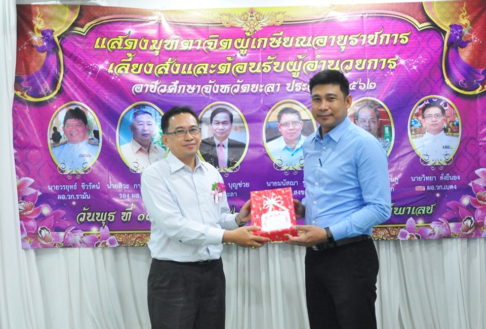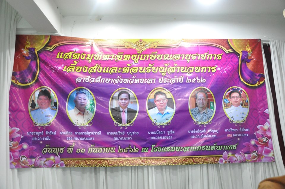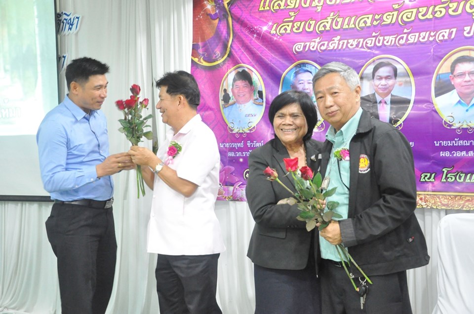 วันที่ 11 กันยายน 2562 เวลา 17.00 น. นายภาณุวัฒน์ บุญยะรัตน์ ผู้อำนวยการวิทยาลัยสารพัดช่างยะลา พร้อมด้วย ผู้บริหาร ร่วมงานแสดงมุทิตาจิตผู้เกษียณอายุราชการ เลี้ยงส่งและต้อนรับผู้อำนวยการอาชีวศึกษาจังหวัดยะลา ประจำปี 2562 ณ โรงแรมยะลาแกรนด์พาเลซ จังหวัดยะลา