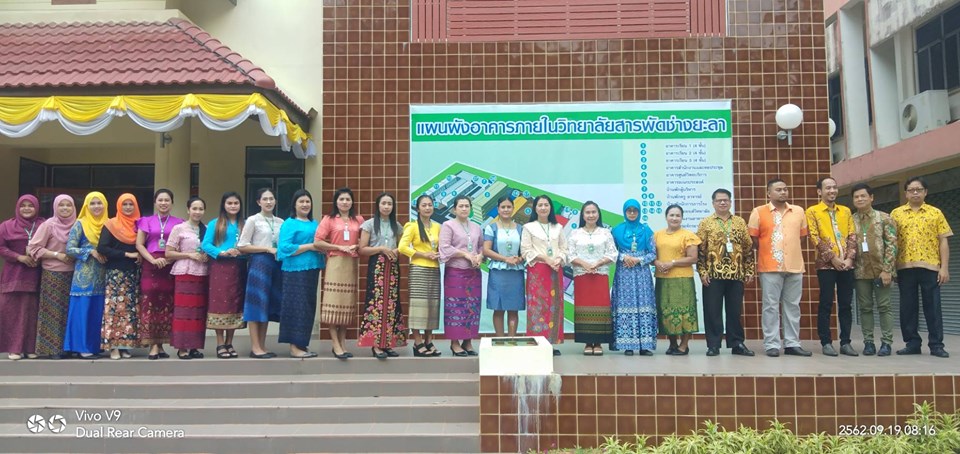 วันพฤหัสบดี ที่ 19 กันยายน 2562 คณะครู และบุคลากรทางการศึกษา วิทยาลัยสารพัดช่างยะลา ร่วมแต่งกายด้วยผ้าไทย ผ้าพื้นเมือง ตามนโยบายของจังหวัดยะลา เพื่อสืบสานและอนุรักษ์ศิลปวัฒนธรรมในความเป็นเอกลักษณ์ไทย ณ วิทยาลัยสารพัดช่างยะลา