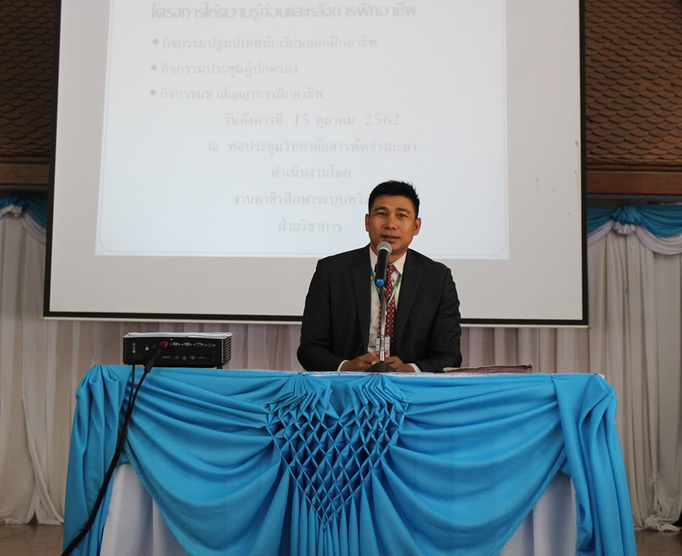 วันอังคาร ที่ 15 ตุลาคม 2562 นายภาณุวัฒน์ บุญยะรัตน์ ผู้อำนวยการวิทยาลัยสารพัดช่างยะลา พร้อมด้วยว่าที่ ร้อยตรีวิเนตร ถนอมรักษ์ษา รองผู้อำนวยการวิทยาลัยสารพัดช่างยะลา ร่วมปฐมนิเทศนักเรียนออกฝึกอาชีพในสถานประกอบการ กิจกรรมประชุมผู้ปกครอง นักเรียน ระดับ ปวช. 2 ระบบทวิภาคี ทำสัญญาการฝึกอาชีพ ประจำภาคเรียนที่ 2 ปีการศึกษา 2562 จัดโดย งานอาชีวศึกษาระบบทวิภาคี ฝ่ายวิชาการ ณ ห้องประชุมวิทยาลัยสารพัดช่างยะลา