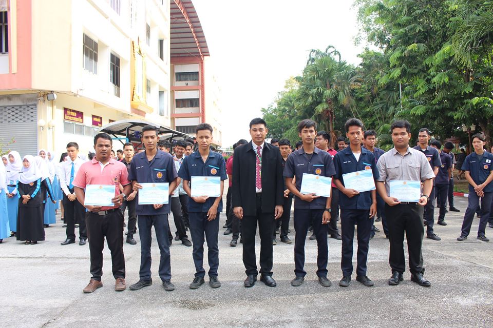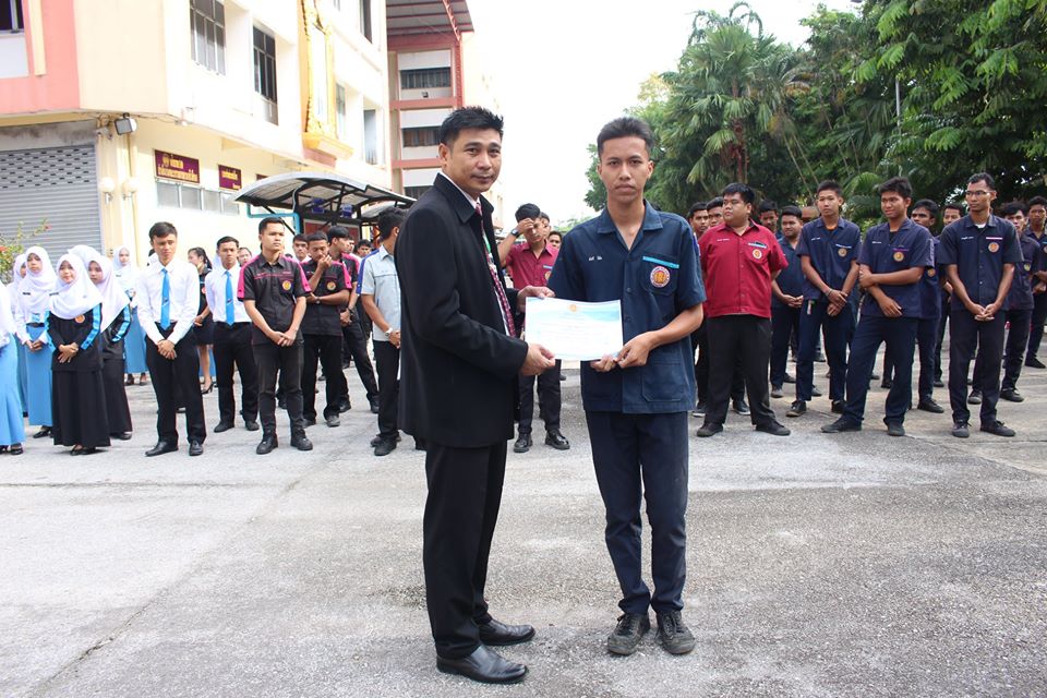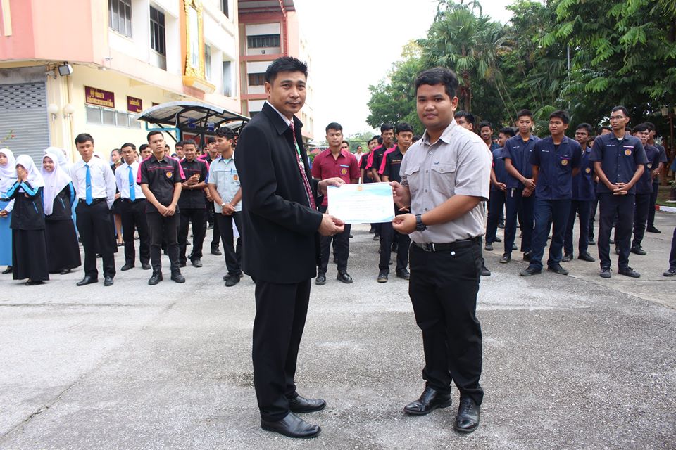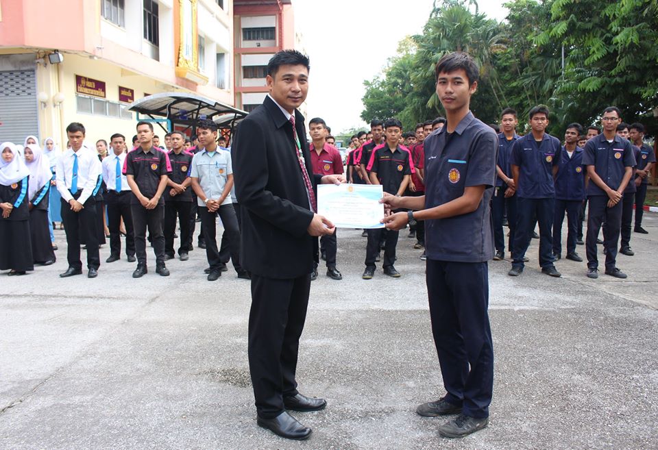 วันอังคาร ที่ 19 พฤศจิกายน 2562 นายภาณุวัฒน์ บุญยะรัตน์ ผู้อำนวยการวิทยาลัยสารพัดช่างยะลา มอบเกียรติบัตร แสดงความยินดี แก่นักเรียน นักศึกษาที่ได้รับรางวัลจากการแข่งขันทักษะวิชาชีพ และทักษะพื้นฐาน ระดับอาชีวศึกษาจังหวัดยะลา ประจำปีการศึกษา 2562 มีรายนามดังต่อไปนี้