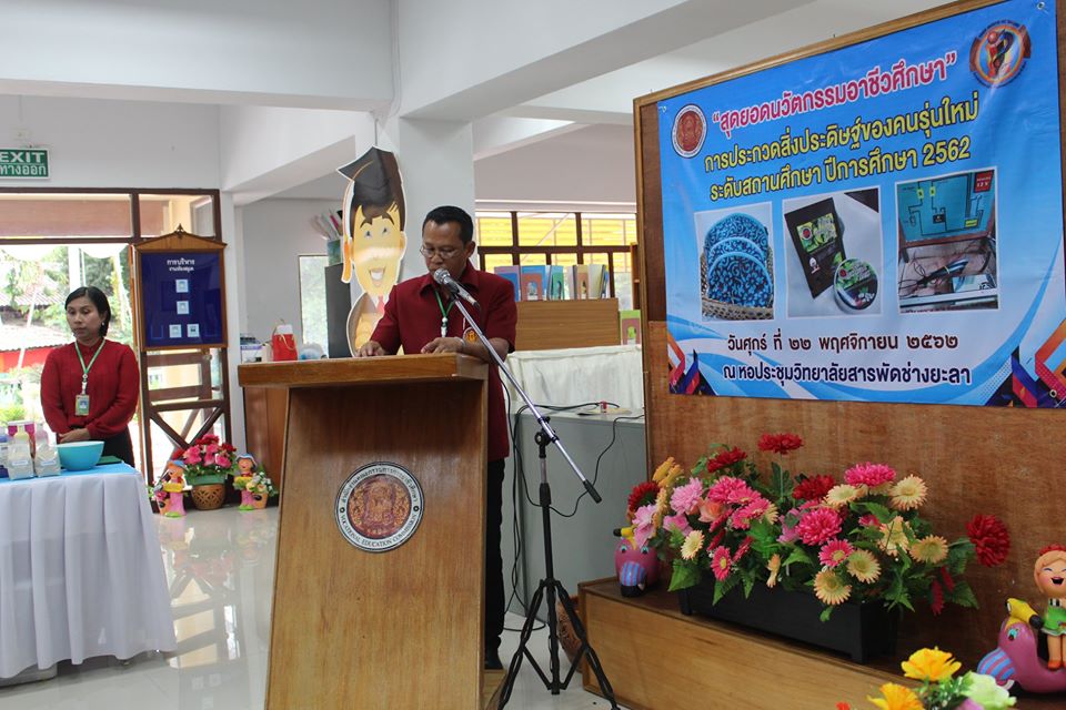 วันศุกร์ ที่ 22 พฤศจิกายน 2562 นายภาณุวัฒน์ บุญยะรัตน์ ผู้อำนวยการวิทยาลัยสารพัดช่างยะลา มอบหมายให้ ว่าที่ ร้อยตรีวิเนตร ถนอมรักษ์ษา รองผู้อำนวยการวิทยาลัยสารพัดช่างยะลา เป็นประธานในพิธีเปิดการประกวด "สุดยอดนวัตกรรมอาชีวศึกษา" สิ่งประดิษฐ์ของคนรุ่นใหม่ ระดับสถานศึกษา ปีการศึกษา 2562 ณ วิทยาลัยสารพัดช่างยะลา