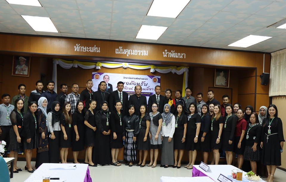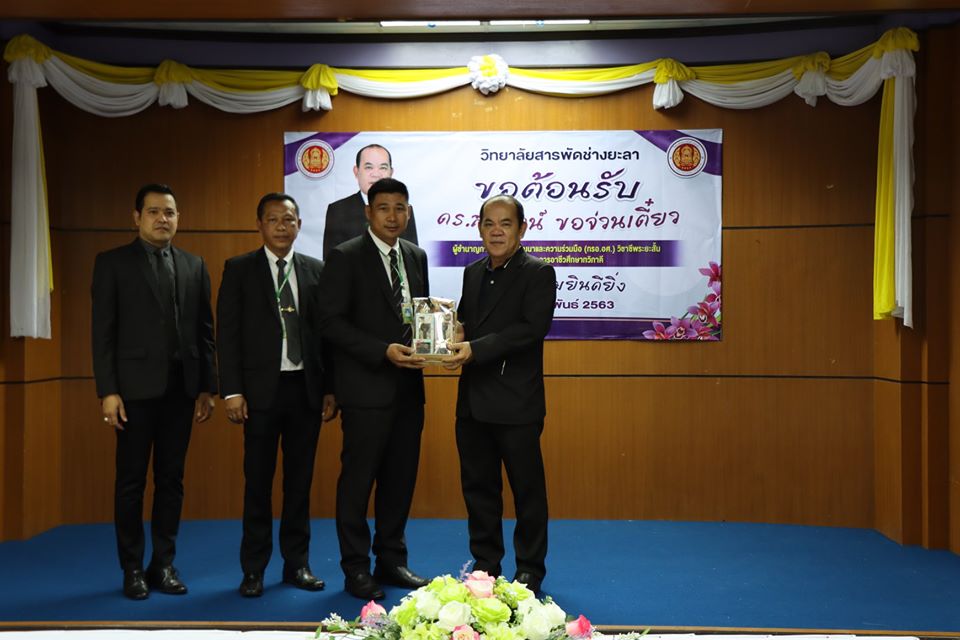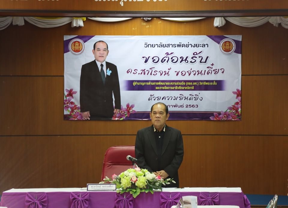 วันที่ 11 กุมภาพันธ์ 2563 นายภาณุวัฒน์ บุญยะรัตน์ ผู้อำนวยการวิทยาลัยสารพัดช่างยะลา พร้อมด้วย ท่านรองผู้อำนวยการ และคณะครู บุคลากร วิทยาลัยสารพัดช่างยะลา ร่วมต้อนรับ ดร.สาโรจน์ ขอจ่วนเตี่ยว ผู้ชำนาญการด้านพัฒนาและความร่วมมือ (กรอ.อศ.) วิชาชีพระยะสั้น และการจัดการอาชีวศึกษา เพื่อยกระดับวิทยาลัยสารพัดช่างยะลาให้สอดคล้องกับจุดเน้นและทิศทางการขับเคลื่อนการจัดการอาชีวศึกษา การยกระดับศักยภาพและพัฒนากำลัง โดยการพัฒนาวิชาชีพระยะสั้นเฉพาะทางของวิทยาลัยสารพัดช่างยะลา 10 กลุ่มอาชีพ ณ ห้องประชุมสะเตง อาคารเรียน 3ชั้น2 วิทยาลัยสารพัดช่างยะลา