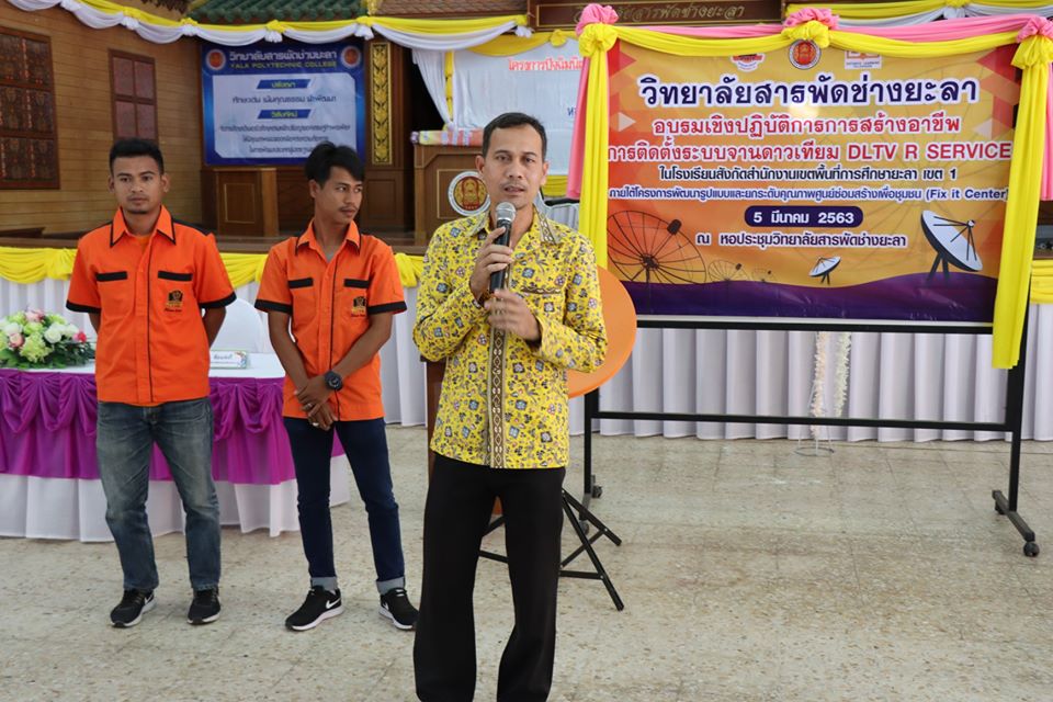วันที่ 5 มีนาคม 2563 นายภาณุวัฒน์ บุญยะรัตน์ ผู้อำนวยการวิทยาลัยสารพัดช่างยะลา เป็นประธานกล่าว ต้อนรับคณะครูที่เข้าร่วมอบรมเชิงปฏิบัติการการสร้างอาชีพการติดตั้งระบบจานดาวเทียม DLTV R SERVICE ในโรงเรียนสังกัดสำนักพื้นที่การศึกษายะลาเขต 1 ณ หอประชุมวิทยาลัยสารพัดช่างยะลา