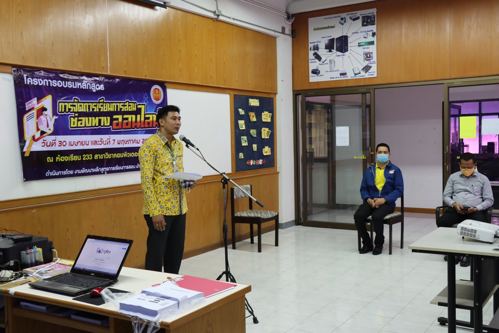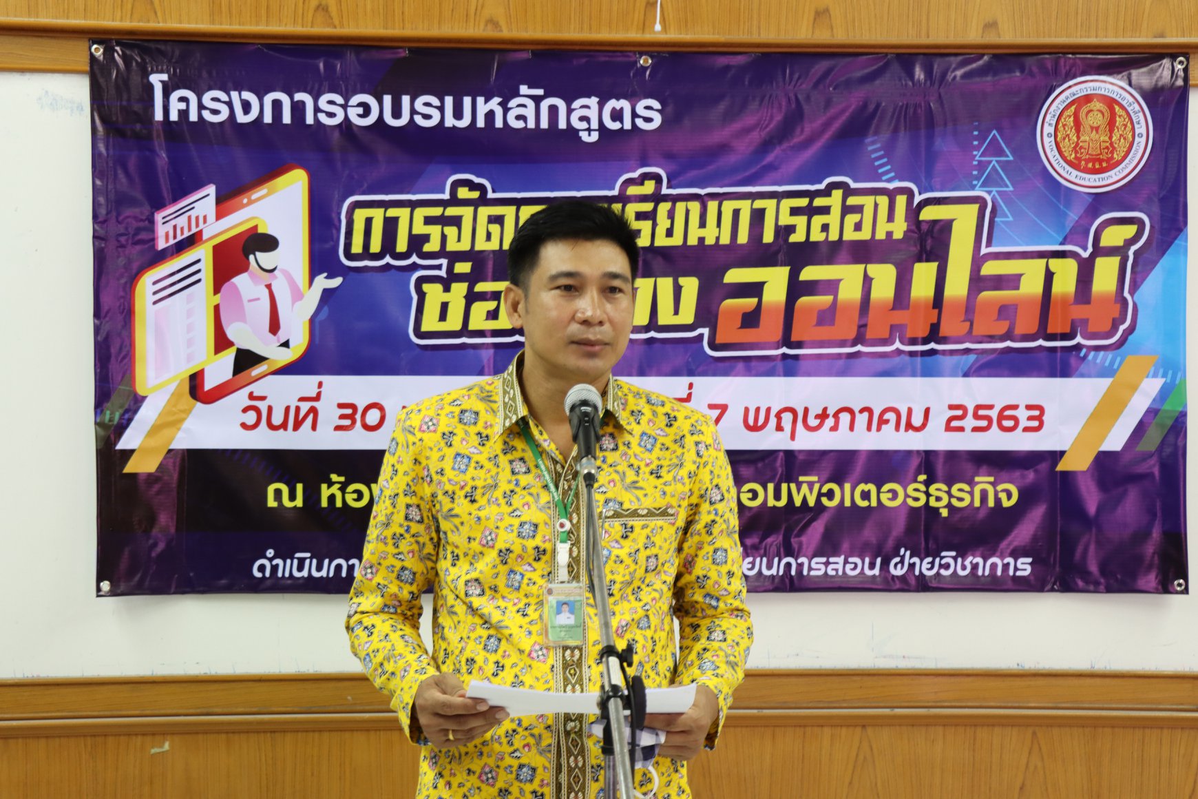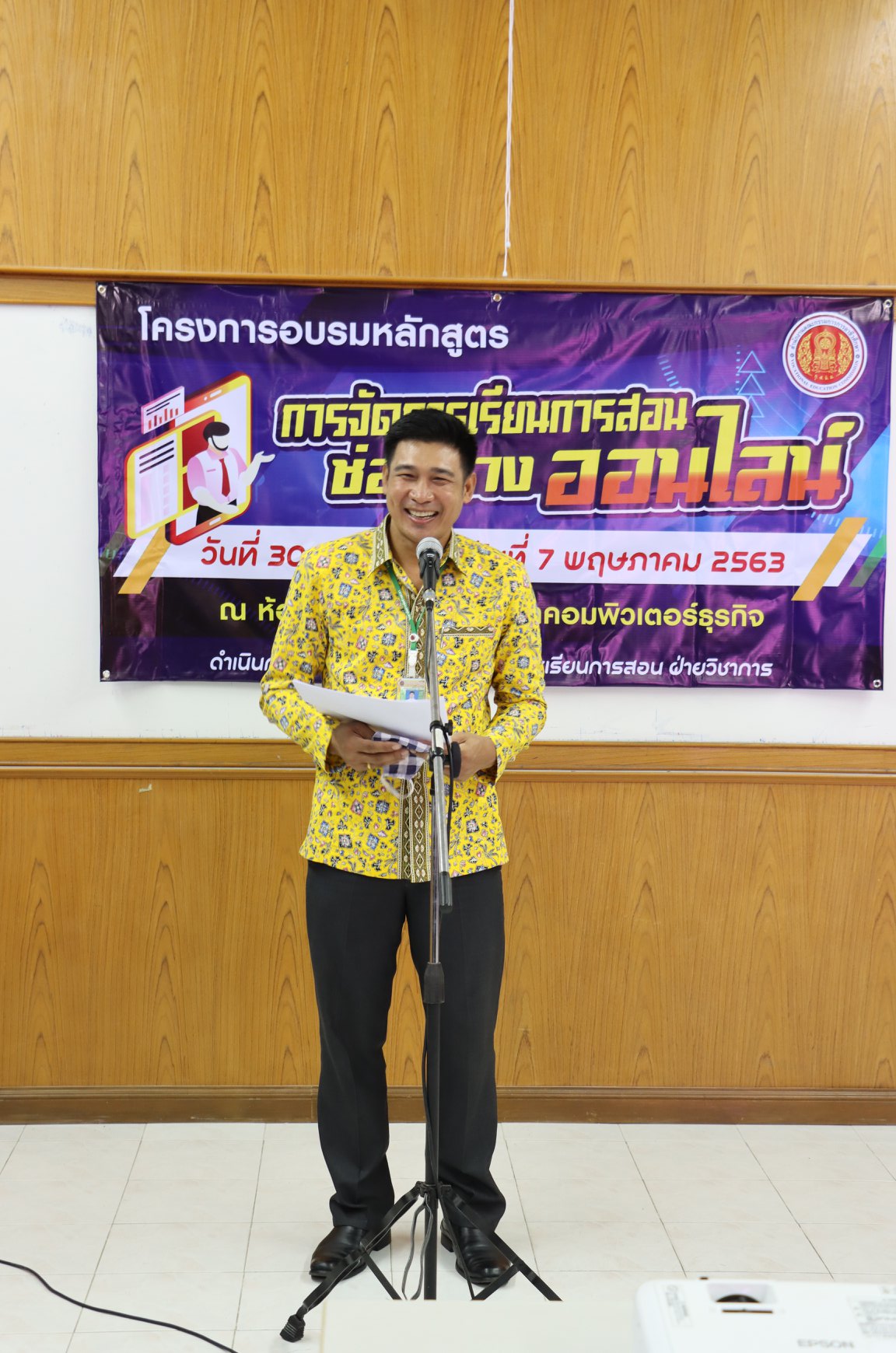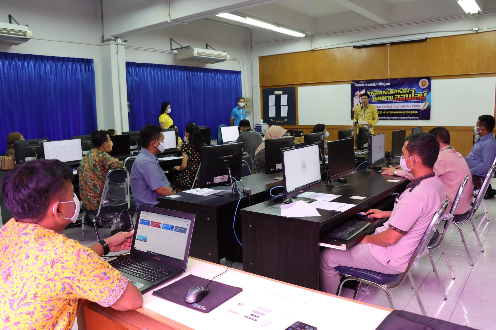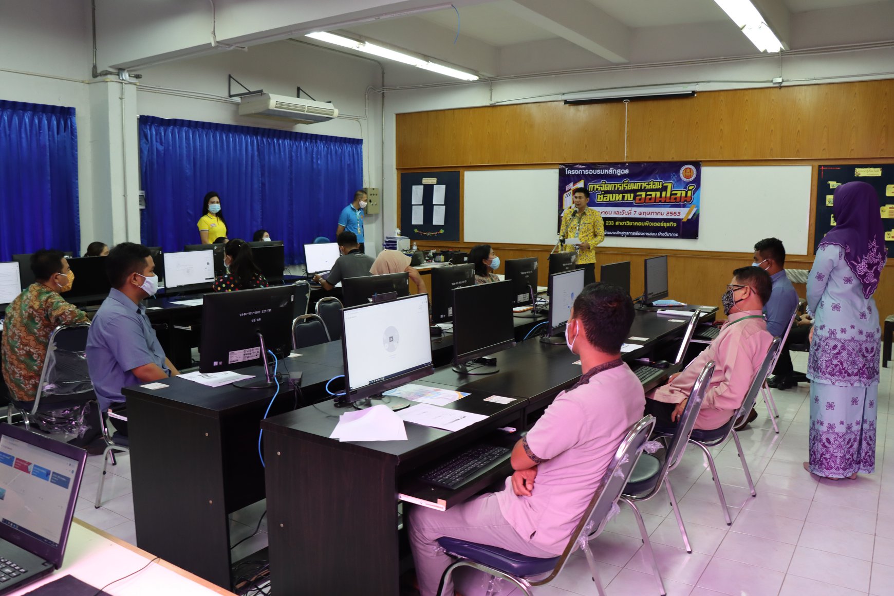 วันที่ 30 เมษายน 2563 นายภาณุวัฒน์ บุญยะรัตน์ ผู้อำนวยการวิทยาลัยสารพัดช่างยะลา พร้อมด้วย ว่าที่ ร.ต. วิเนตร ถนอมรักษ์ษา และนายโกวิทย์ นวลศรี รองผู้อำนวยการวิทยาลัยสารพัดช่างยะลา ครูและบุคลากรทางการศึกษา เข้าร่วมอบรมโครงการการจัดการเรียนการสอนช่องทางออนไลน์ เพื่อนำไปประกอบในการเรียนการสอนได้จริง วิทยาลัยจึงจัดให้มีการอบรมหลักสูตรการเรียนการสอนช่องทางออนไลน์ให้กับ นักเรียน นักศึกษา ณ ห้องเรียน 233 สาขาคอมพิวเตอร์ธุรกิจ วิทยาลัยสารพัดช่างยะลา